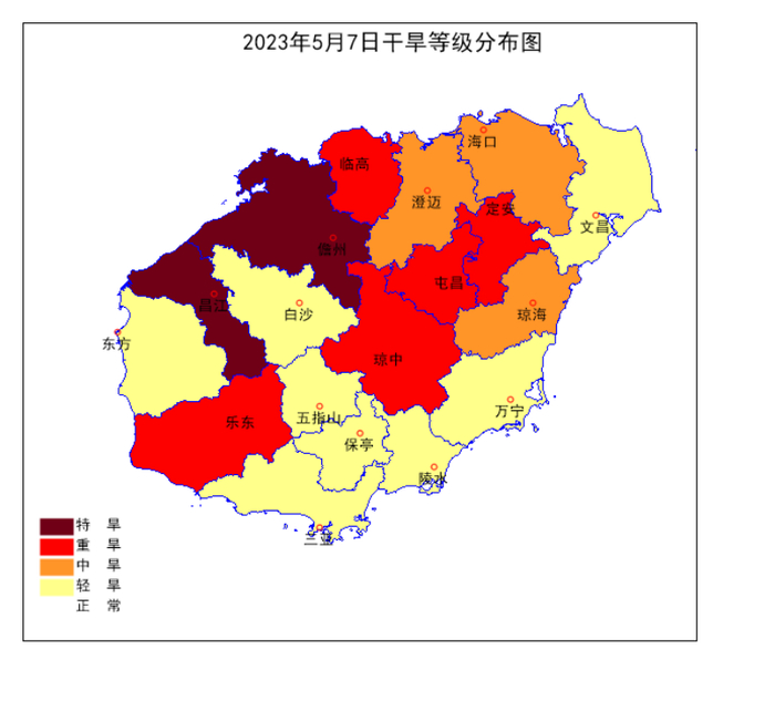 2023年3月1日至5月6日,海南岛平均降水量66.4毫米,较常年同期偏少61.8%,平均气温偏高0.5℃。3月上旬开始,本岛气象干旱发生并持续发展,3月26日全岛各市县均出现中至重度气象干旱,3月下旬后期气象干旱情况短暂缓解后又再次发展,至5月上旬中后期达最重,5月7日,本岛2个市县达特旱、5个市县重旱、11个市县轻到中旱。5月11日,海南岛进入雨季,各地气象干旱状态逐渐缓解。