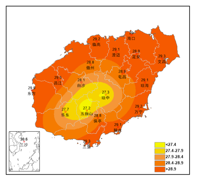 2023年8月海南省各地平均气温空间分布(单位:℃)