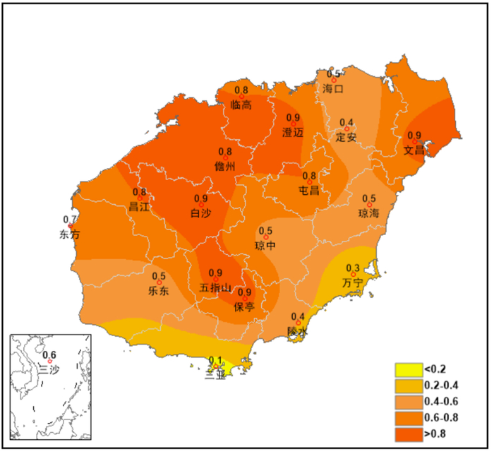 2023年春季海南岛平均高温日数16.8天,较常年偏多6.9天,为历史同期第4高位,其中5月全岛高温日数10.8天,较常年偏多5.0天。5月上旬高温天气过程极端性强,5月6日昌江、临高、澄迈和儋州4个国家气象观测站日最高气温均超过40℃,其中,昌江41.5℃、临高41.2℃双双打破海南省国家气象观测站最高气温历史年极值;海口39.2℃,与当地5月历史最高纪录持平。高温天气对西部地区早稻抽穗扬花和荔枝、龙眼果实的贮存和保鲜不利。
