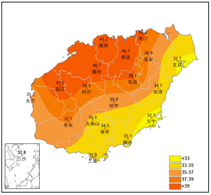 2023年8月海南省平均气温28.9℃,较常年偏高1.1℃,为有记录以来的最高值。各地平均气温27.2~30.6℃,较常年偏高0.6~1.5℃,定安、澄迈、临高、儋州、文昌、昌江、五指山、保亭、陵水和三沙共10个市县月平均气温突破当地8月平均气温最高值。8月18日五指山最高气温(36.1℃)突破当地8月历史极值,文昌(36.8℃)与当地8月历史最高纪录持平。高温天气对暑期旅游活动和人体健康不利。
