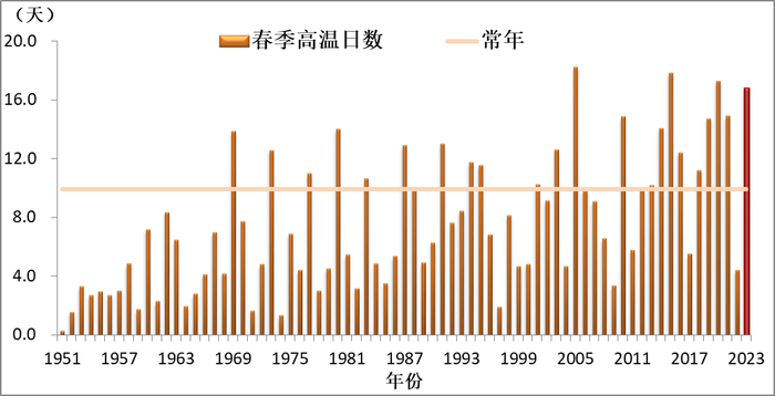 1951~2023年春季海南岛平均高温日数变化(单位:天)