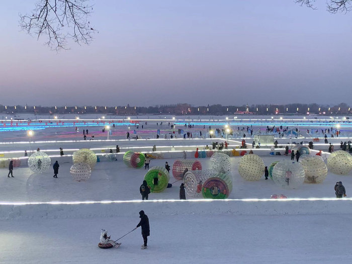 2024年1月5日,星期五,“尔滨放假了”。这天是第40届哈尔滨国际冰雪节,哈尔滨全市公休。冰雪大世界上午11点开门,在黑龙江大学读大二的陈晨9点到检票厅排队。进门后,跟着人流奔跑,她把耳罩跑掉了,15分钟后到大滑梯,前面有百来号人,又排队1个多小时。陈晨去年也来过,那时候“来了就能坐”。今年,“大叔的服务特别好,我坐上滑梯之前,还给我戴上帽子。”