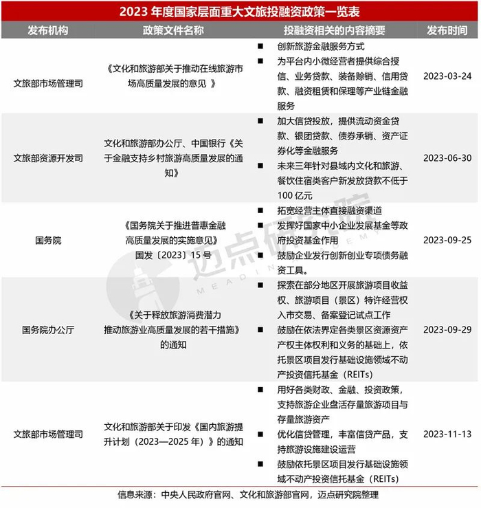从国家层面看,2023年,国务院、文化和旅游部出台多项促进和支持文旅企业投融资的利好政策,如加大信贷投放、拓宽融资渠道、支持探索旅游项目特许经营权入市交易、鼓励在合法合规前提下发行景区REITs等,为文旅企业融资提供了强有力的政策支撑,利于充分发挥金融资本在旅游产业发展、结构调整、技术创新等方面的“提质增效”作用。