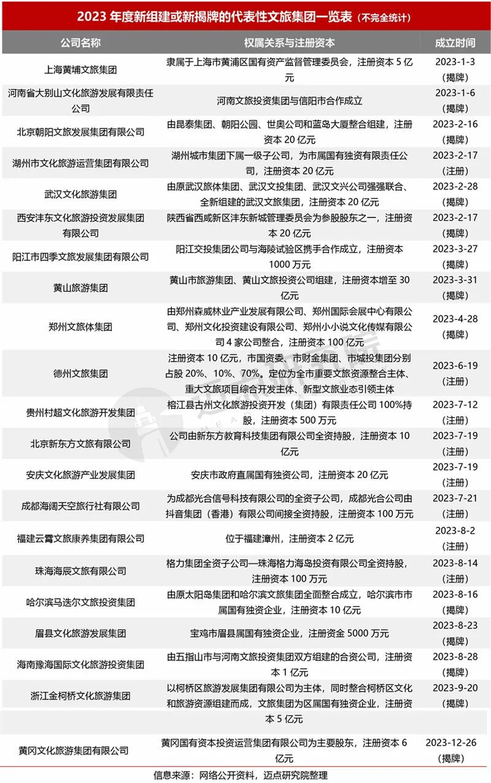 具体从全年新注册或揭牌的代表性文旅集团(企业公司)情况看,17家公司为国有文旅集团,如上海黄埔文旅集团、北京朝阳文旅集团、武汉文旅集团、郑州文旅体集团、黄山旅游集团等均属此类。