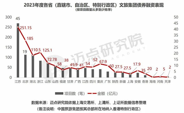 从2023年度各省区的文旅集团融资表现看,涉及21个省(直辖市、自治区、特别行政区)。江苏省各文旅集团融资最为活跃,无论是融资项目数量还是金额均“遥遥领先”,完成45笔融资,合计金额251.15亿元;其余省份中融资金额超百亿元的省(直辖市、自治区)还包括北京市(185亿元)、浙江省(125.1亿元)和湖北省(110.5亿元)。