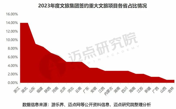 从重大文旅项目签约地点看,以浙江省、湖北省签约项目最为密集,二者合计占比约28%;其次是山东、福建、陕西、河南4省,各省签约项目数占比处于5%-10%区间;广东、安徽、江西等12个省份签约项目数占比均低于5%。整体来看,2023年签约重大文旅项目空间分布呈现“全国多点开花、华东华中密集”的特征。