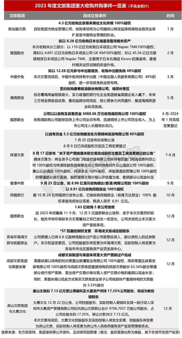 纵观2023全年,从年初到年尾,文旅重大资产收购并购事件频发,以收购股权、收购景区资产、股权置换为主要形式,整体并购整合加速。
