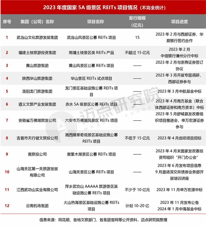 2023年,文旅景区REITs项目火热推进。据迈点研究院统计,全年有12家5A景区披露REITs项目,具体为武当山景区、南靖土楼景区、黄山风景区、华山景区、龙门石窟景区、赤水丹霞旅游区、万佛湖景区、湘西州矮寨•十八洞•德夯大峡谷景区、赛里木湖景区、山海关景区、萍乡武功山景区、火山热海旅游区。