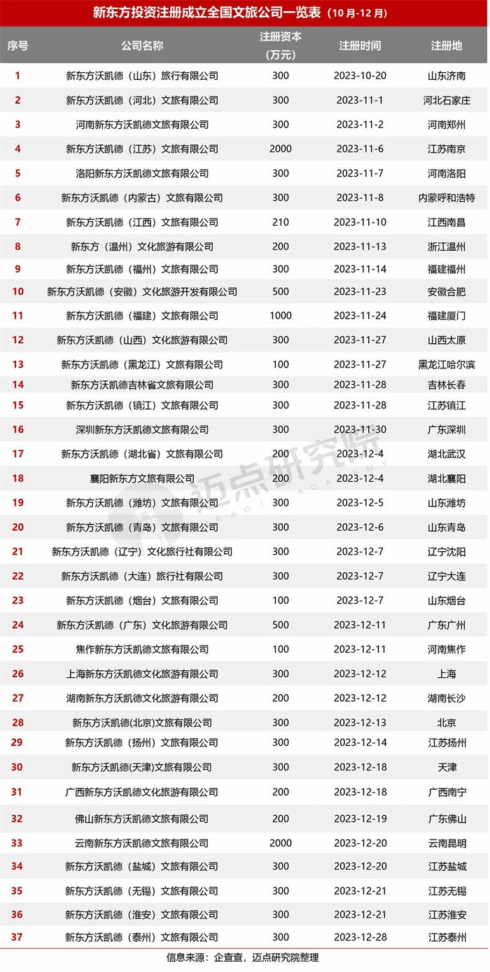 尤其是新东方集团,继7月注册成立“北京新东方文旅公司”之后,从10月至12月,新东方先后在山东、河北、河南、福建、江苏、内蒙古、江西、浙江、安徽、山西、黑龙江、吉林、广东、湖北、辽宁、上海、湖南、北京、天津、广西、云南21个省(自治区、直辖市)注册了37家控股文旅公司,整个文旅版图遍及华东、华北、华中、东北、华南、西南6个大区,完成了其转战文旅赛道的区域布局。未来,能否真正为文旅行业带来创新模式,能否成为行业“革新者”,有待持续关注。