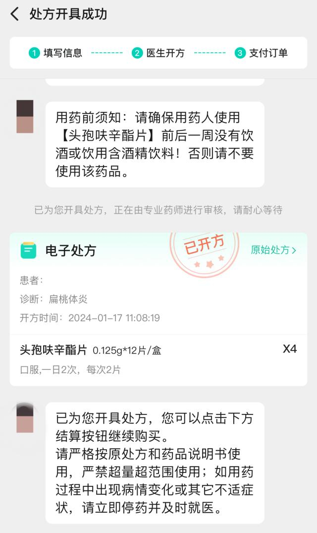 “您好,我是医生XX,已收到您的复诊开药诉求,正在为您诊断开方,预计1分钟,请不要离开……”自动发来三条问话后,记者并未回复任何信息,一份电子处方就顺利开出。只需完成支付,处方药就可以送货上门。