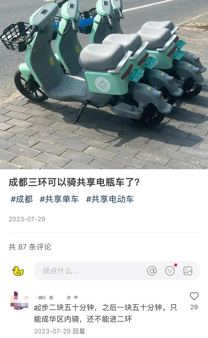 记者在社交媒体上看到,至少从2023年7月份起,成都成华区就已经出现了共享电单车,其中包括现在已有的品牌。