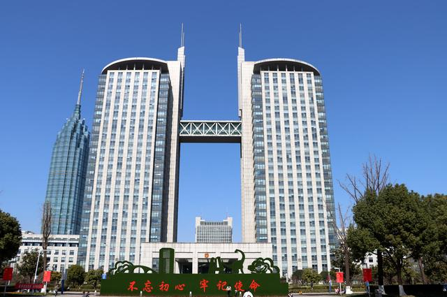 江苏常州,晴空下的地标建筑行政中心“双子楼”。图据视觉中国