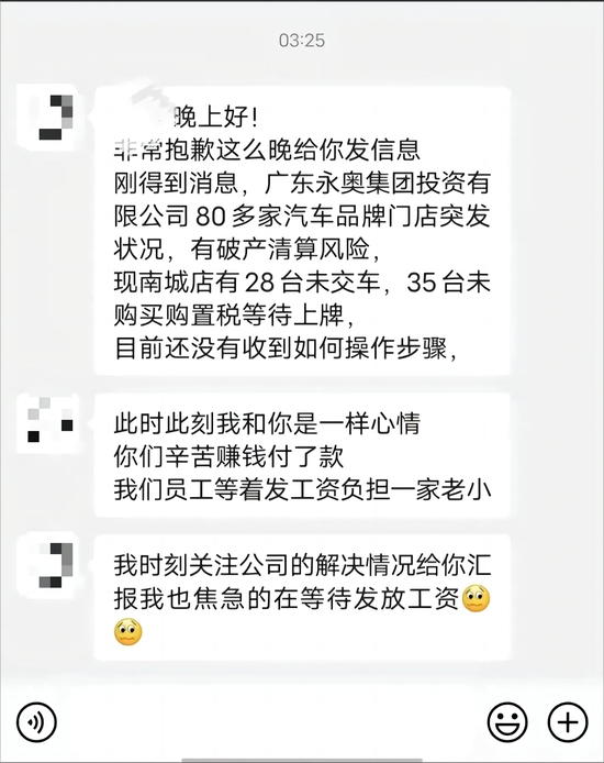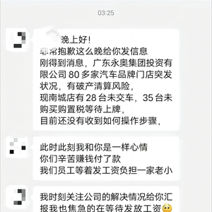 随着广东永奥“爆雷”消息的不胫而走,越来越多的员工、消费者正通过短视频、社交媒体等渠道曝光自身遭遇。有用户表示:“被永奥拖欠了4个月工资的路过。”也有消费者发文求助称:“我提车了,没上牌,塘厦永轩的,怎么办?”