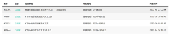 记者查询“东莞市阳光热线问政平台”网站获悉,广东永奥在2023年4月就存在拖欠员工工资等情况。有员工投诉称,广东永奥在2023年4月时,仍未发放员工2023年1月份的工资,涉及门店为其东莞地区30余家4S店。“如有实名投诉就要求员工离职,或者恶意调整岗位,强逼员工离职,不给任何补偿。”上述投诉信息显示。