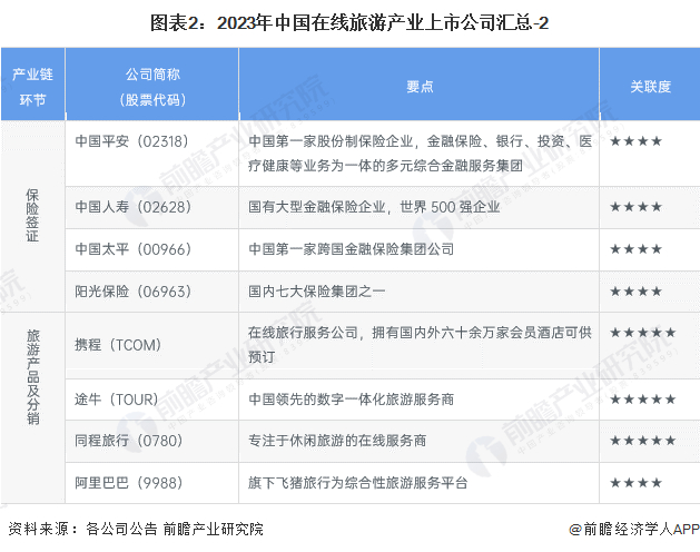 目前,我国在线旅游产业链上下游的上市公司数量较多,分布在各产业链环节。其中,涉及在线旅游产业链的上游企业包括交通服务、酒店、保险签证等企业,中游主要上市公司有携程(TCOM)、途牛(TOUR)、同程旅行(0780)、阿里巴巴(9988)等。