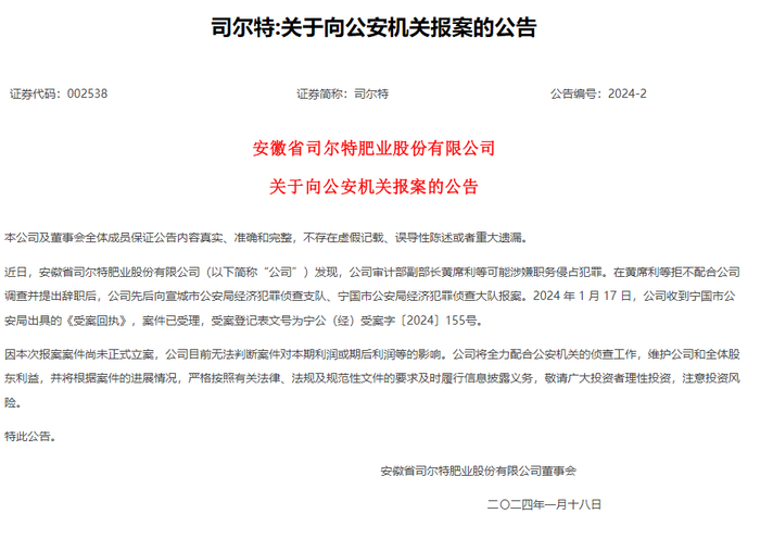据公告,2024年1月17日,司尔特收到宁国市公安局出具的《受案回执》,案件已受理。