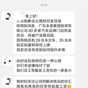 随着广东永奥“爆雷”消息的不胫而走,越来越多的员工、消费者正通过短视频、社交媒体等渠道曝光自身遭遇。有用户表示:“被永奥拖欠了4个月工资的路过。”也有消费者发文求助称:“我提车了,没上牌,塘厦永轩的,怎么办?”