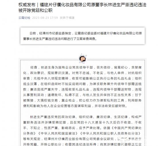 2023年8月23日,云霄纪 检微信公众号发布一则消息,福建片仔癀化妆品有限公司原董事长林进生严重违纪违法被开除党籍和公职。
