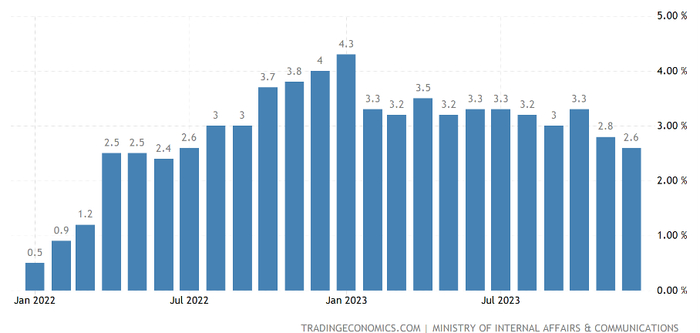 1月19日,日本总务省统计局公布的数据显示,12月消费者价格指数(CPI)同比增长2.6%,涨幅较上月收窄0.2个百分点;扣除生鲜食品的核心CPI同比增长2.3%,较上月收窄0.2个百分点,创2022年7月以来新低。