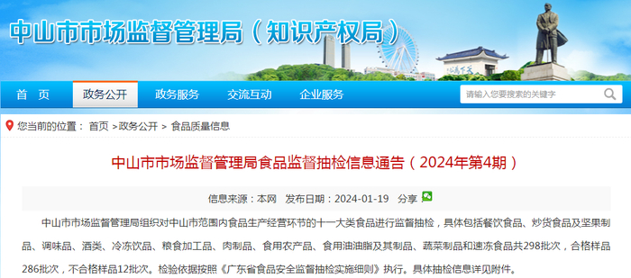 中山市市场监督管理局食品监督抽检信息通告(2024年第4期)