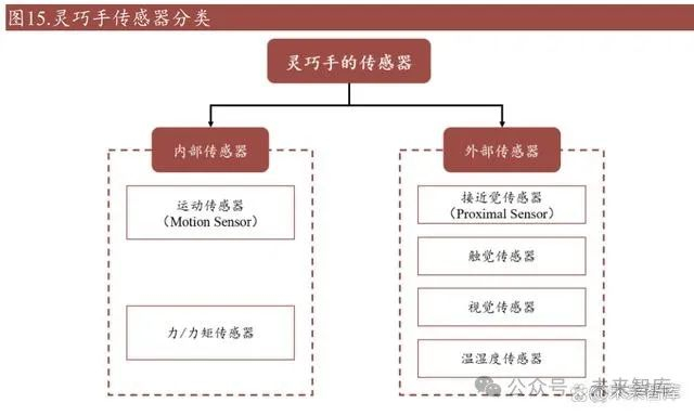运动传感器:在灵巧操作过程中,运动传感器用于测量机器人手的关节角度、 电机位移等。对于机器人的运动学分析而言,这两类信息都是必不可少的。 更精确的关节角度信息可以减少指尖的运动误差。两种常见的运动传感器为 位置传感器(Position Sensor)和弯曲传感器(Bend Sensor)。 力/力矩传感器:力/扭矩传感器提供机械手的动态信息,动态信息是机械手 进行稳定的灵巧抓取和操作的必要条件。因此,力/扭矩传感器对于与未知 物体进行交互至关重要,无论在操作安全性还是自主性方面都是如此。对于 机械手和机器人手而言,关节处通常都配备有关节扭矩传感器。
