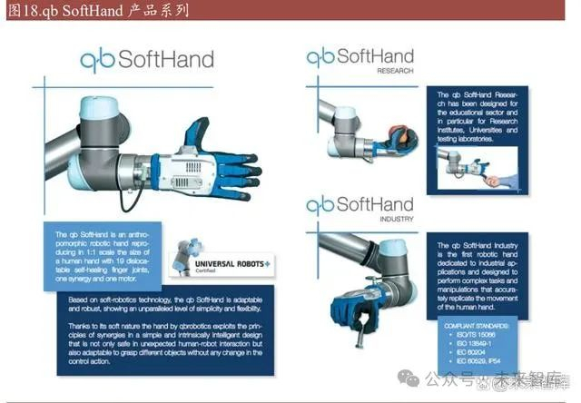 qb Robotics 成立于 2011 年,致力于将软体机器人技术用于研发和生产各种创新 的产品,如灵巧手,夹爪,手柄等。qb SoftHand 是备受瞩目的柔性机械手,具 备极强的交互性,能与周围环境、物体和人类亲密互动。通过单电机驱动,qb SoftHand 变得即插即用、简单易控。此外,qb SoftHand 与市场上主要的合作机 器人品牌集成,并与 UR+生态系统完全兼容,为应用提供更多便利性。 qb SoftHand Industry 是一款基于 MechaLogical 技术的新型先进拟人机器人手,也 是首款专为工业应用设计的拟人机器人手。它采用腱传动和单电机驱动,同时复 制了人类手部运动的 "第一次协同",实现了灵活、适应性强的抓取。集成了 qbSoftHand Industry 的系统可完成的任务包括测试、质量检测、取放、复杂处理、 装配、机器操作、研发等。