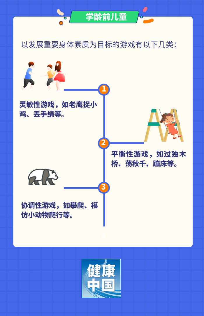不同年龄儿童的运动形式有所区别。哮喘控制良好的学龄前儿童,应以多样化的形式参与运动,如爬行、步行、骑行、做游戏等,并可酌情参加如游泳、篮球、体操等专项运动。