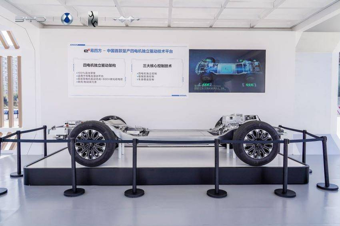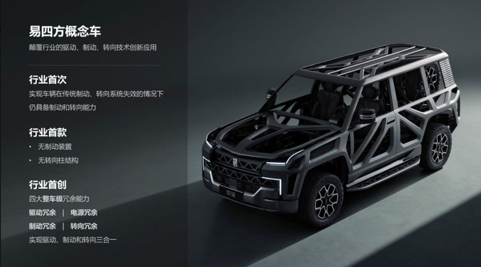易四方是以四电机独立驱动为技术底座,在动力架构上,包括前后双电机总成、中央计算平台、CTC刀片电池等核心部件实现100%自主研发的技术平台。该技术能实现四个电机独立驱动、整车深度融合感知、车身稳定矢量控制。