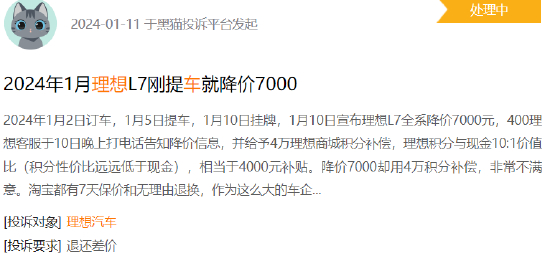 但是在购车不到一个月,李女士发现,2024年1月11日,理想公司推出L7、L8、L9全系年初优惠活动,不同车型版本降价范围在3.5万~3.8万元,自己的车型优惠后直降7000元。李女士认为,4S店销售存在误导消费者行为,随即向理想公司申请补偿。