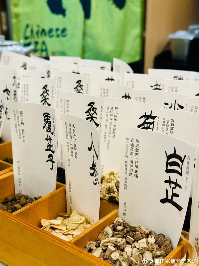 荷田水铺,2020年始创于青岛的“养生茶饮”品牌,主打药食同源的专有养生饮品,获得3轮融资,开出60多家门店。2023年12月初,其沈阳首店迅速冲上当地热门榜第一。