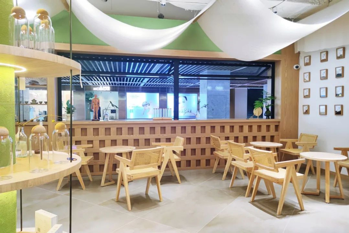 产品上,强调所有原料均为原产地直接定制,优选5A级品质,天然无硫熏、无添加,原创刺梨沙棘早C饮(维C之王)、桑葚树莓晚A水(美白抗衰)、羽衣刮油水等;门店设计上,配以中药柜、草药标本等元素。