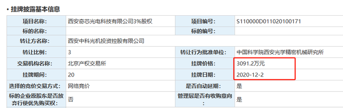 每经记者关注到,并非只有国开科创在出售奇芯光电股权。早在2020年4月,西安中科光机投资控股有限公司就在北京产权交易所挂牌出售奇芯光电3%股权,转让底价为1681.50万元。不过仅挂牌一个多月,西安中科光机投资控股有限公司又申请中止该转让申请。