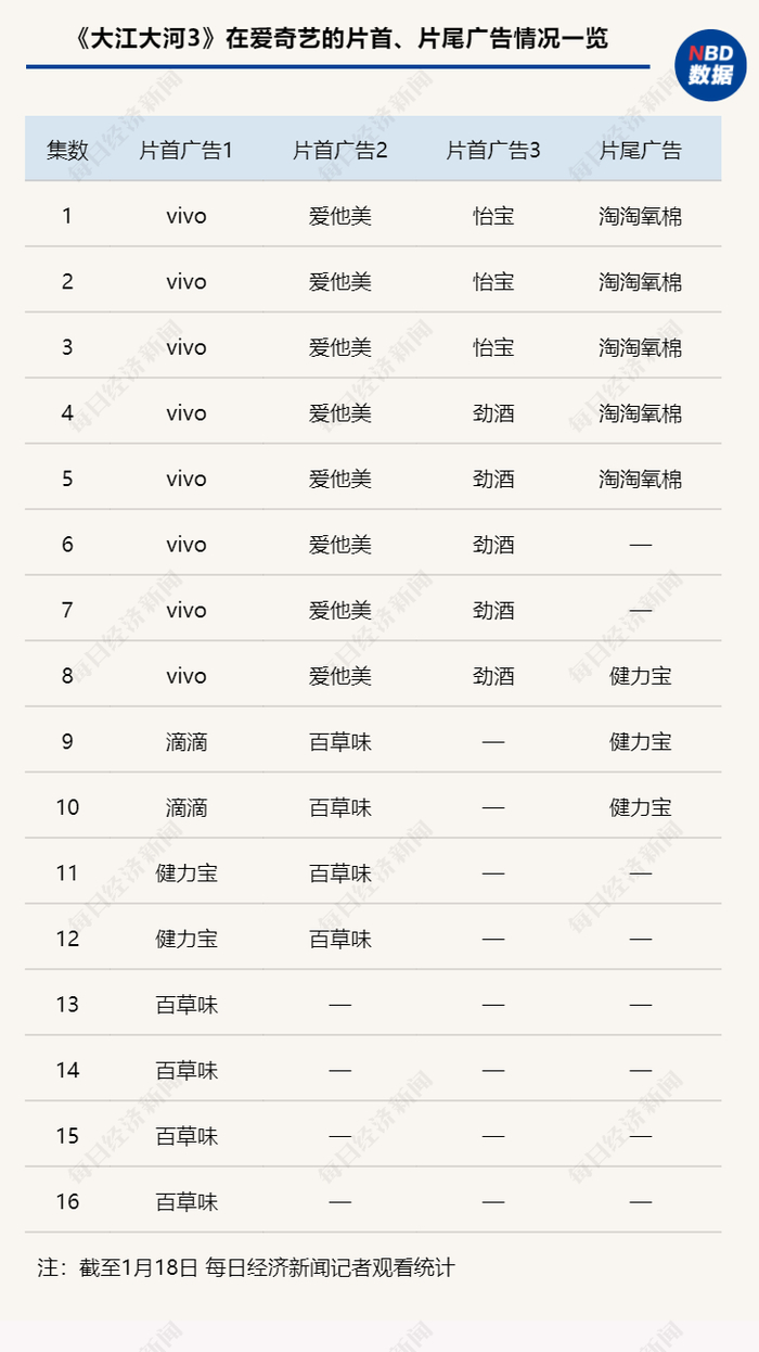 这引发了网友的关注与讨论。截至1月18日,正午阳光、爱奇艺等出品的《大江大河3》播放了18集,《每日经济新闻》记者逐集观看发现:该剧在爱奇艺播出时,片首和片尾的广告中先后出现过8个品牌,分别为vivo、爱他美、怡宝、劲酒、淘淘氧棉、健力宝、滴滴、百草味;片尾和片首广告最多时为4个,自13集开始,仅剩百草味一个。到1月18日晚播出的《大江大河3》17集、18集,爱奇艺的片首片尾广告均为零。