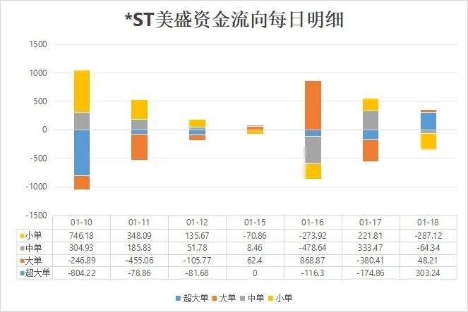 而在连续涨停期间(1月15日至18日),*ST美盛每日成交额分别为997.24万元、5931.85万元、9669.08万元、12865.52万元,主力资金前两日分别净流入62.40万元、752.56万元,1月17日净流出555.28万元,18日净流入351.45万元,占成交额的比率分别为6.26%、12.69%、-5.74%、2.73%。