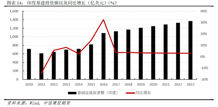但从数据反映的现实情况来看,印度的基础设施投资在2016年曾有过一波较大幅度的增长,其余时间均保持在3%水平上下浮动,对于需求的拉动则相对有限。