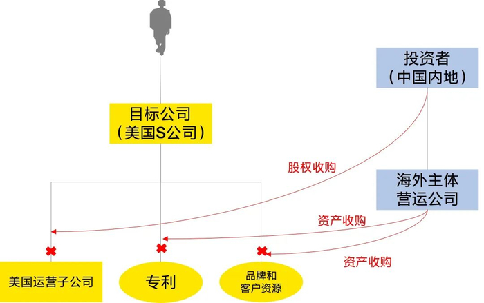 以下图示为一个资产收购和股权收购并行的虚拟案例 ——由投资者的海外主体运营公司直接收购目标资产:
