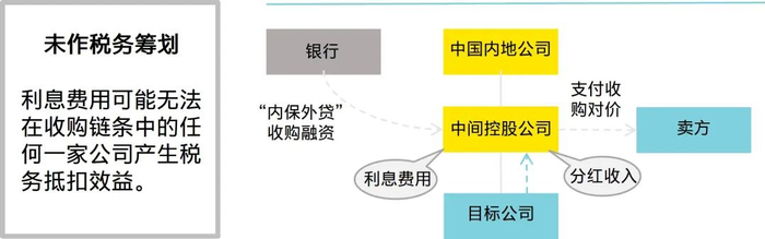 架构一:常见“内保外贷”模式下,中间控股公司通常无需就取得的分红收入缴纳当地税收,其利息费用也无法抵扣。
