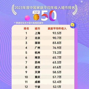 近日,一份由“中国城市经济新势力峰会”发布的题为“2023年度中国家庭平均年收入城市排名”的图表在网络上被广泛转发,引发关注。该图表显示,排名前三的城市分别为上海(92.5万元)、北京(90.7万元)和深圳(83.8万元),第4至第10名分别是广州、杭州、南京、苏州、武汉、天津和重庆。19日上午,国家统计局一名工作人员表示,他们从未发布过任何以家庭为单位的收入统计,也没有搞过类似的调查,“我们这边只发布过‘居民人均可支配收入’。”上游新闻(报料邮箱baoliaosy@163.com)记者通过中国社会组织网、中国社会组织信息公开平台、天眼查APP等渠道搜索,均未查询到“中国城市经济新势力峰会”的具体信息。