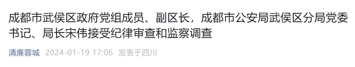 1月19日,据“清廉蓉城”微信公众号消息,成都市武侯区政府党组成员、副区长,成都市公安局武侯区分局党委书记、局长宋伟涉嫌严重违纪违法,目前正接受成都市纪委监委纪律审查和监察调查。