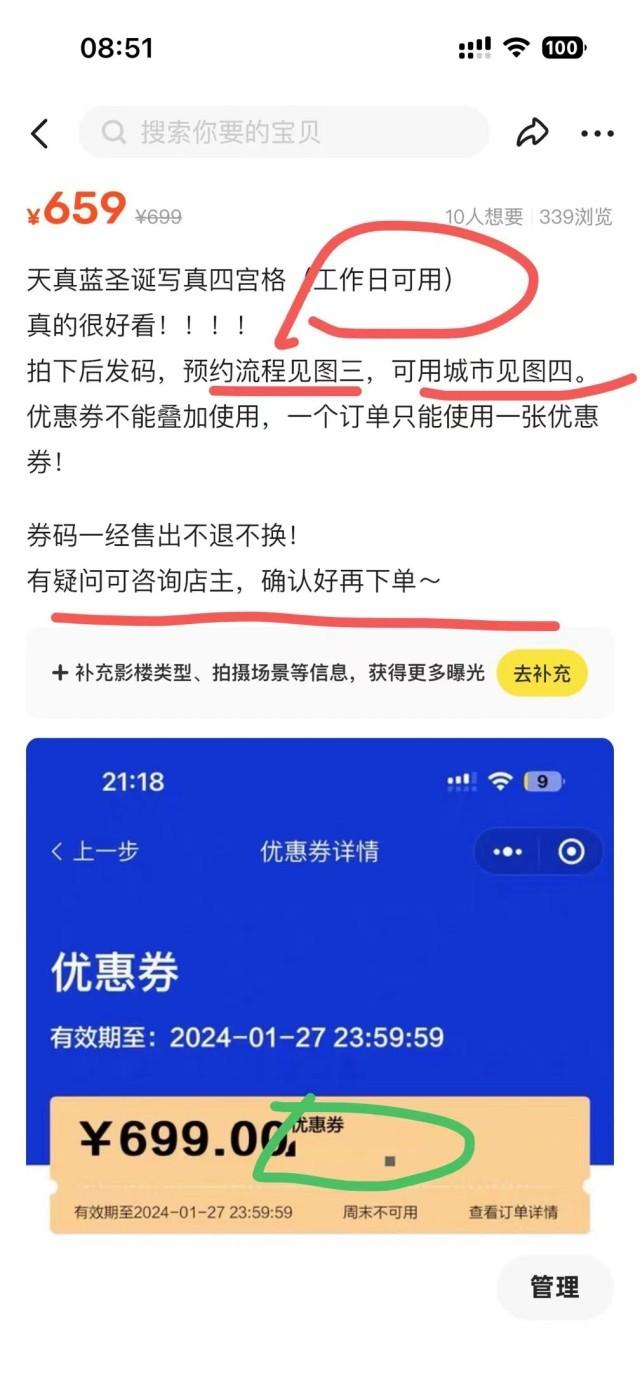 厦门的小花(化名)日前向澎湃质量观投诉平台反映,2023年12月21日晚,她在闲鱼二手交易平台以659元的价格出售了一张原价为699元的“天真蓝拍摄优惠券”商品,而买家在拍下商品付款以后以“优惠券使用时间与自己预期不符”为由申请退款。小花表示,她在对方拍下商品后已将商品券码信息发给买方,且页面中明确标注了券码使用时间及“券码一经售出不退不换”等字样,于是拒绝了买家的退款申请。
