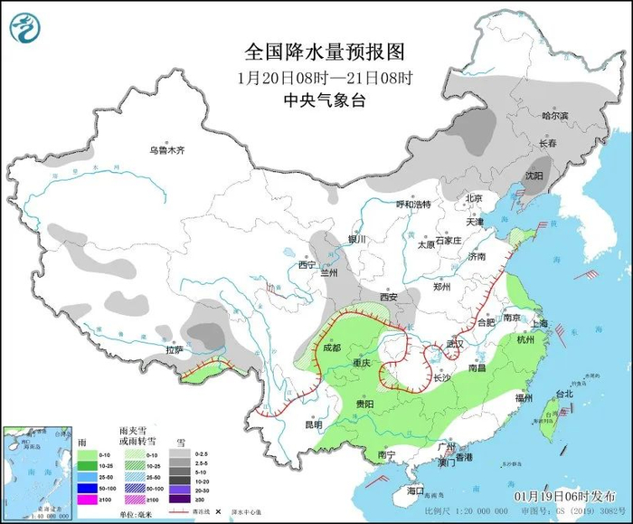 昨日,内蒙古、陕西、河南等地出现小到中雪或雨夹雪,湖南、湖北、江西等地出现明显降雨。预计今天,强降雪主要位于内蒙古中东部,呼和浩特有小雪;南方降雨维持,雨带从广西北部一直绵延至长三角地区,雨量普遍有中到大雨,局地暴雨。2024年的首场寒潮也蓄势待发,预计20日至23日,寒潮将给中东部带来剧烈降温,深入南方后,还将带来大范围强降雪。