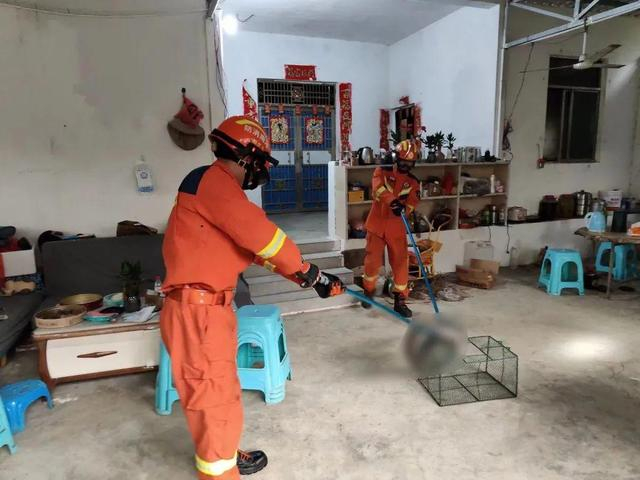 17时10分,消防员到达后发现,闯入居民家中的并非普通的黑蛇,而是一条眼镜王蛇!随后,3名经验丰富的消防员在做好安全措施的前提下开始捕蛇。经过几分钟的侦查,消防员一前一后等待恰当时机合力将2米多长眼镜王蛇捕捉,装进铁笼中“打包”带走。