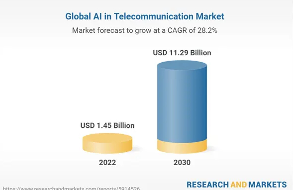 “AI in Telecommunication”市场总份额,2022年为14.5亿美元左右