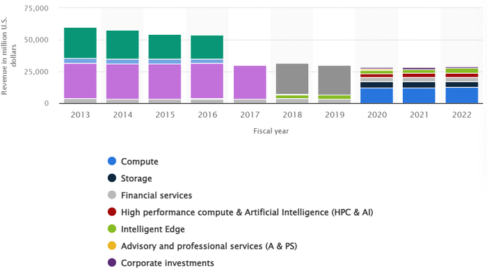 目前HPE各业务板块营收贡献度拆解(@statista)