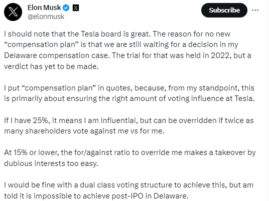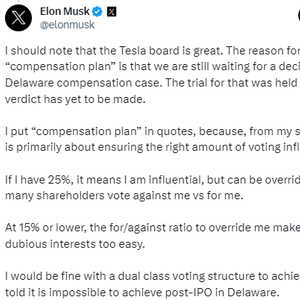 马斯克在X上为自己的计划作出了辩护,他强调,25%这个比例,既能避免他过于独裁,也能让他更好地维护特斯拉的利益: