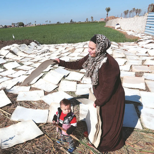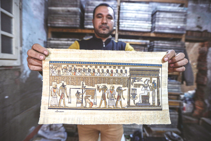 利用生长在尼罗河三角洲沼泽中的纸莎草,古埃及人通过各种工序将其做成纸张使用,但这项制作技艺早已失传。上个世纪,埃及一些专家经过研究重新找到了这种古老纸张的制作方法。位于埃及尼罗河三角洲东部省的卡拉姆斯村就是这种古老纸张手工制作技艺的传承者。