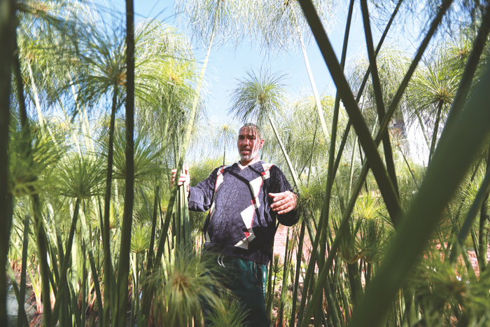 艺术家瓦格迪·穆罕默德展示用纸莎草纸绘画的莎草画