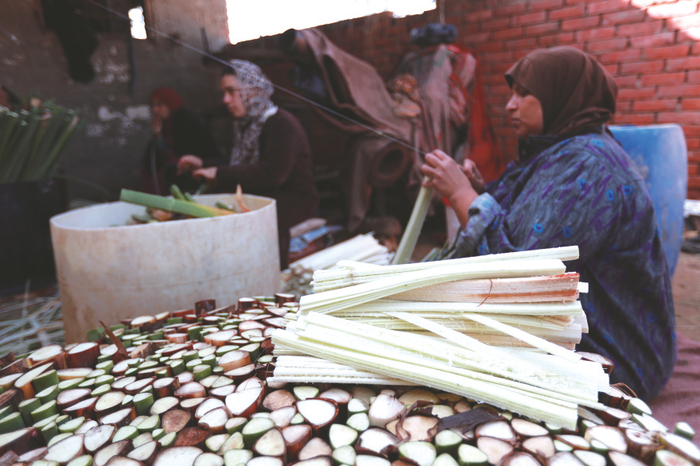 1月16日,在埃及东部省卡拉姆斯村村民赛义德的纸莎草纸制作作坊,村民晾晒纸莎草制作成的纸(上图)。