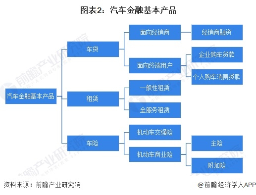 汽车金融包括车贷、租赁、保险三类基本产品,它们各自又可以再细分:
