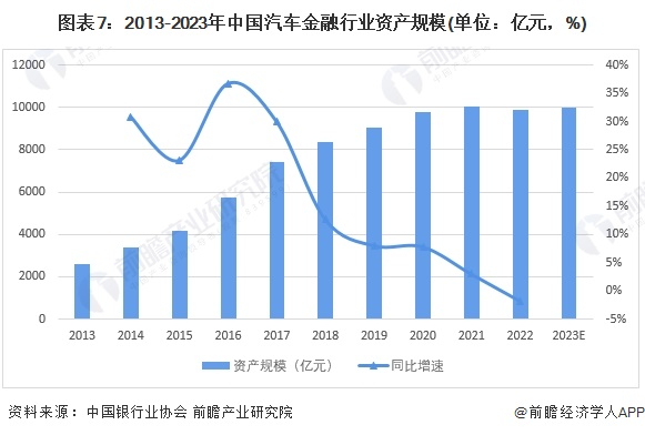 自2004年首批汽车金融公司正式成立以来,十多年的时间,中国汽车金融行业发展迅速,根据中国银行业协会披露的数据,截至2022年末,全国25家汽车金融公司资产规模达到9891.95亿元,总体保持稳定。结合历年统计数据及市场变动趋势,初步预测2023年汽车金融行业资产规模将小幅上涨,约为1万亿元。